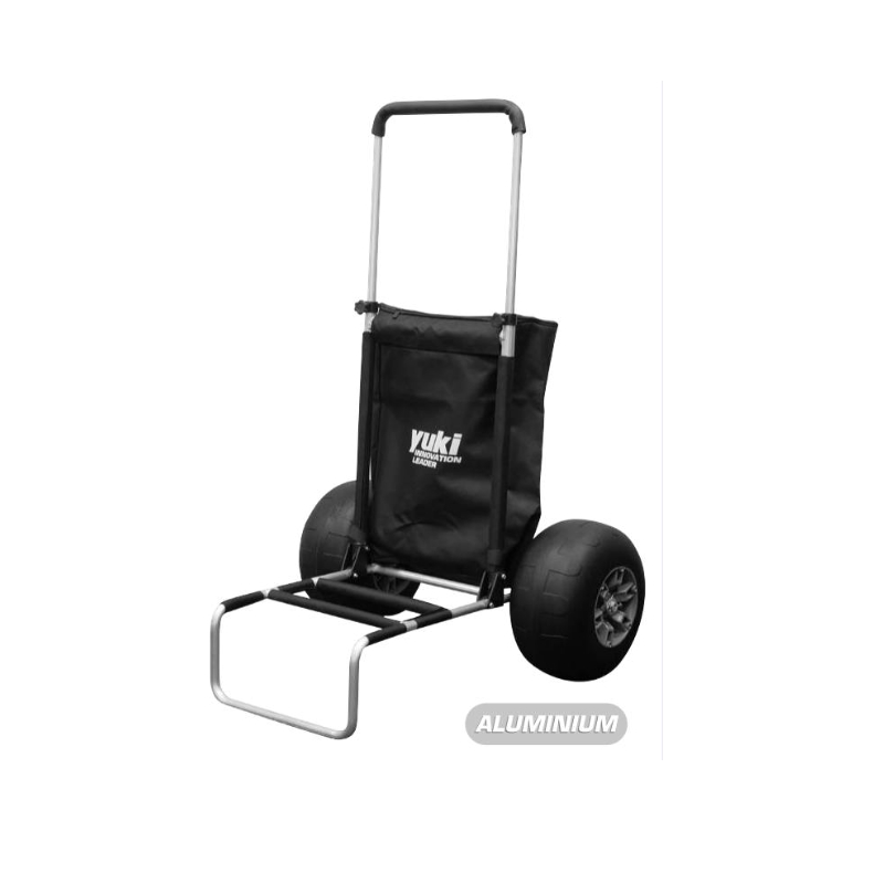 Přepravní vozík na rybářské vybavení od YUKI Comeptition vyroben z pevné hliníkové konstrukce, osazený polstrovanou impregnovanou taškou a masivními pevnými koly pro bezpečné zdolání i hrubších ternů s ohledem na bezpečnost Vašeho nákladu.